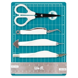 We R Aqua mini tools, essential for scrapbooking and crafts in general. The kit contains everything needed to measure, cut, and pierce various materials. Includes: