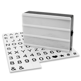 Caja de luz personalizable colocando láminas con caracteres en la pantalla hasta formar palabras. Se puede poner sobre una mesa o colgar en la pared.