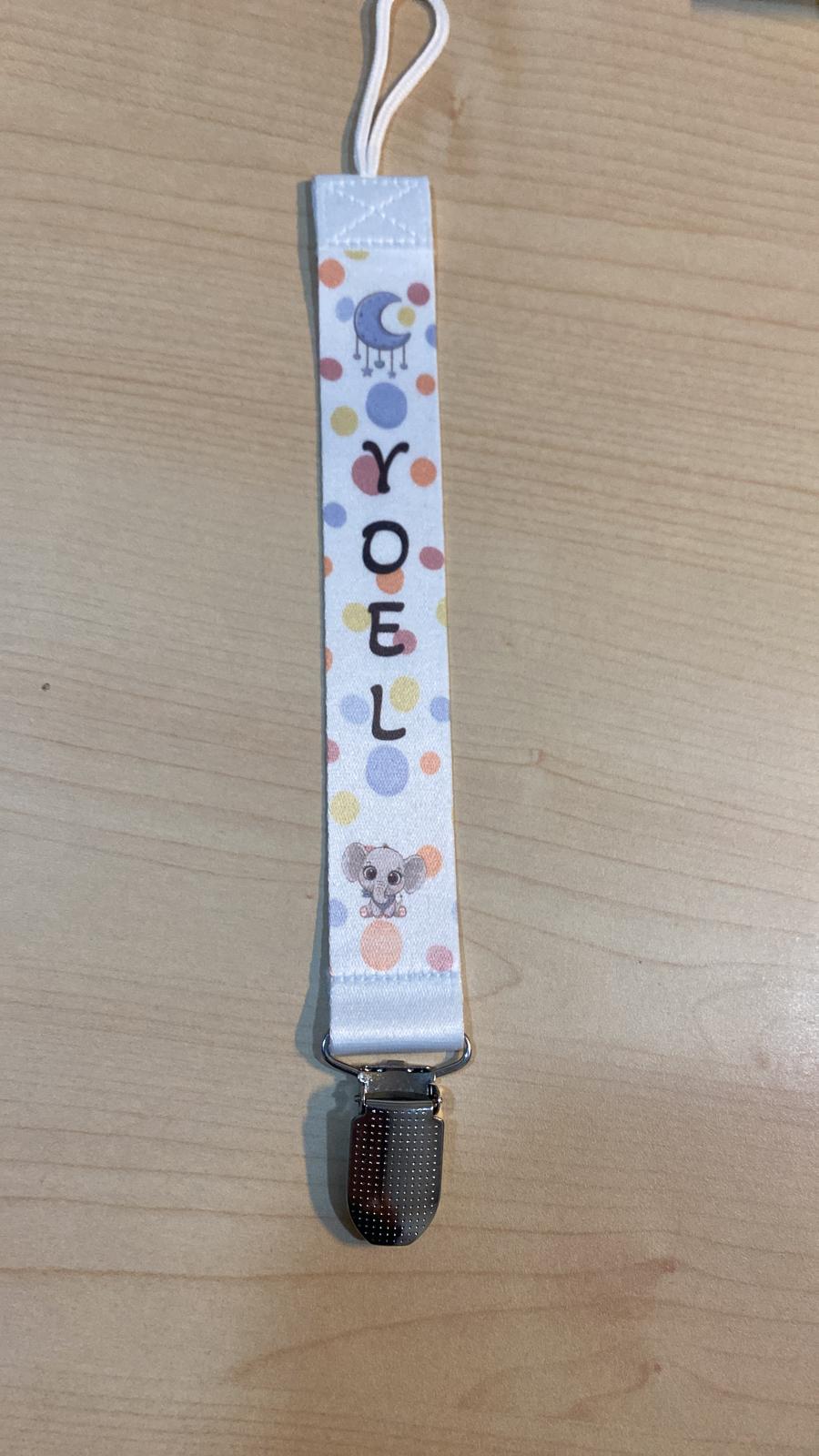 - Extremo con pinza metálica para sujetarlo a la ropa. El otro extremo con elástico para fijar el chupete