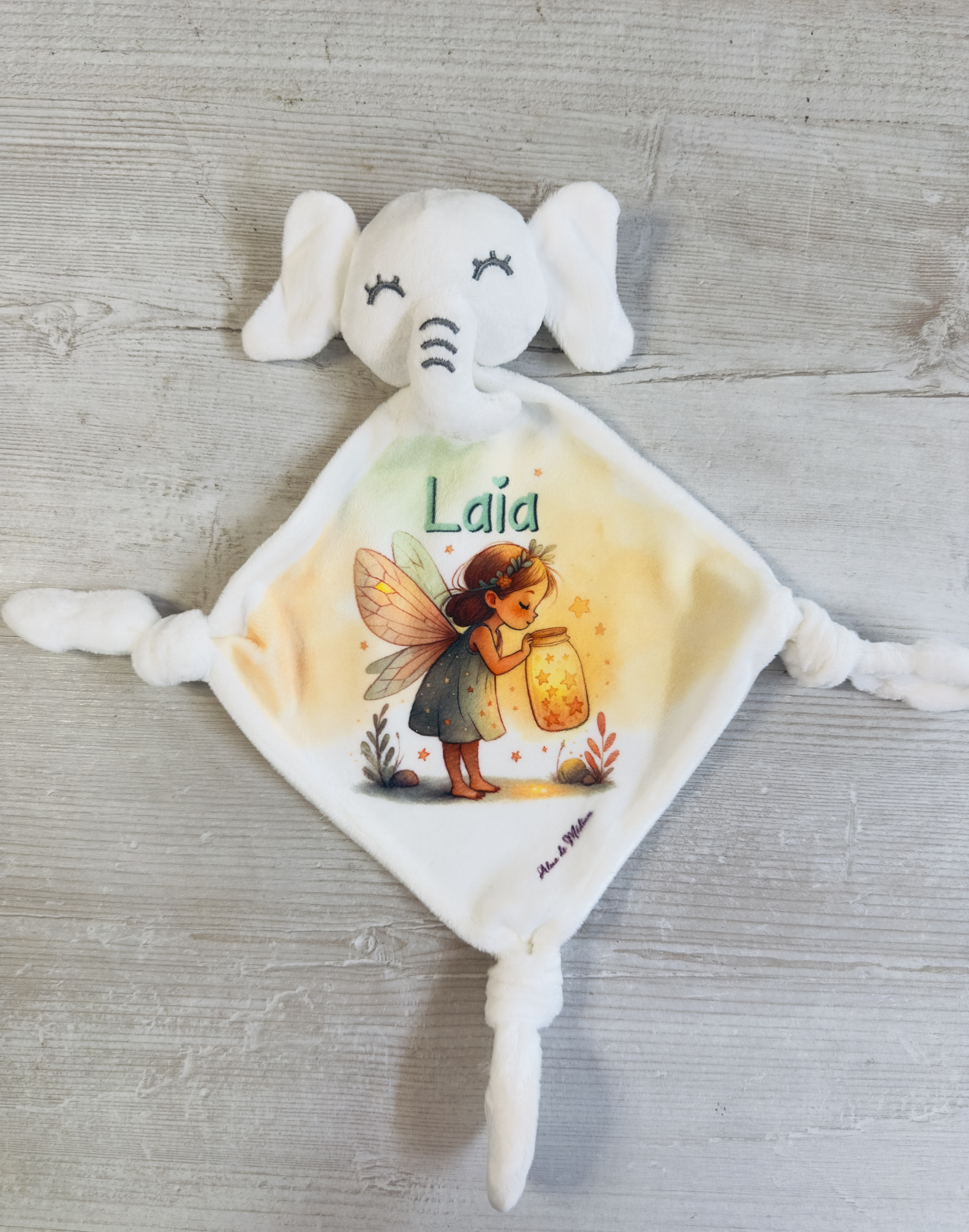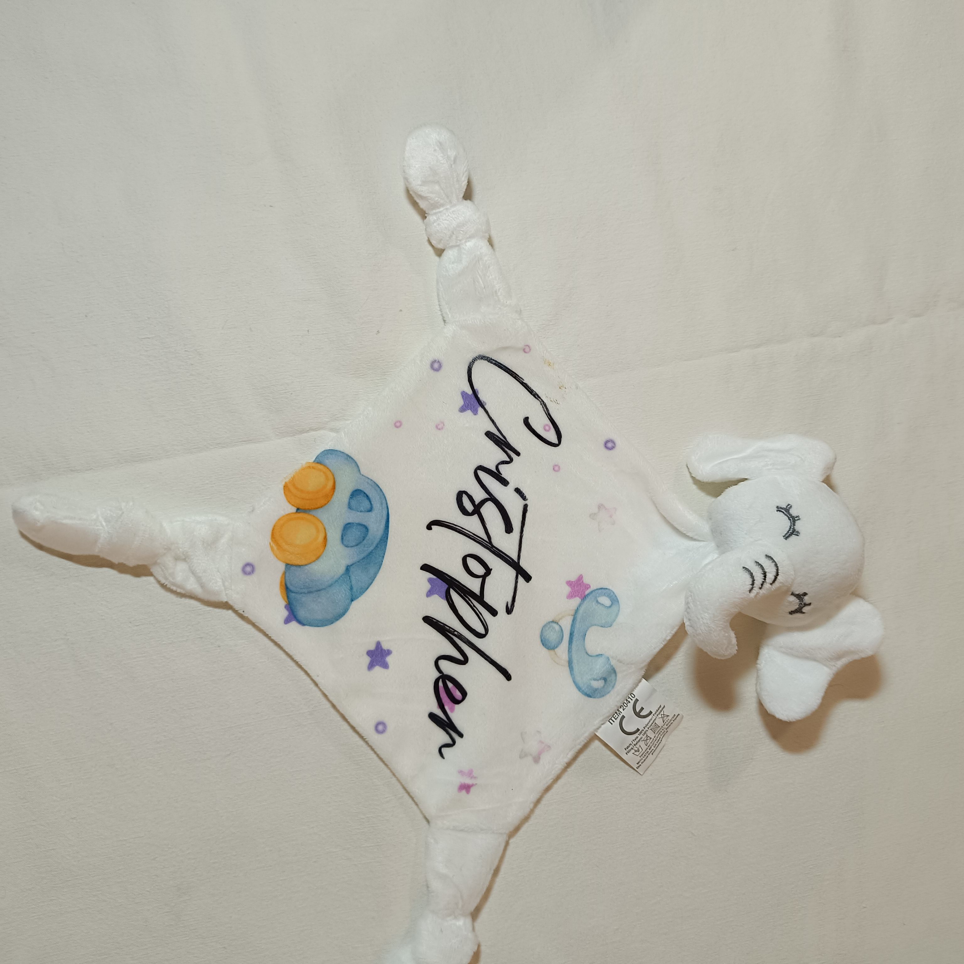 - Doudou elefante con 3 nudos en sus esquinas. Se desatan sin esfuerzo para facilitar la personalización