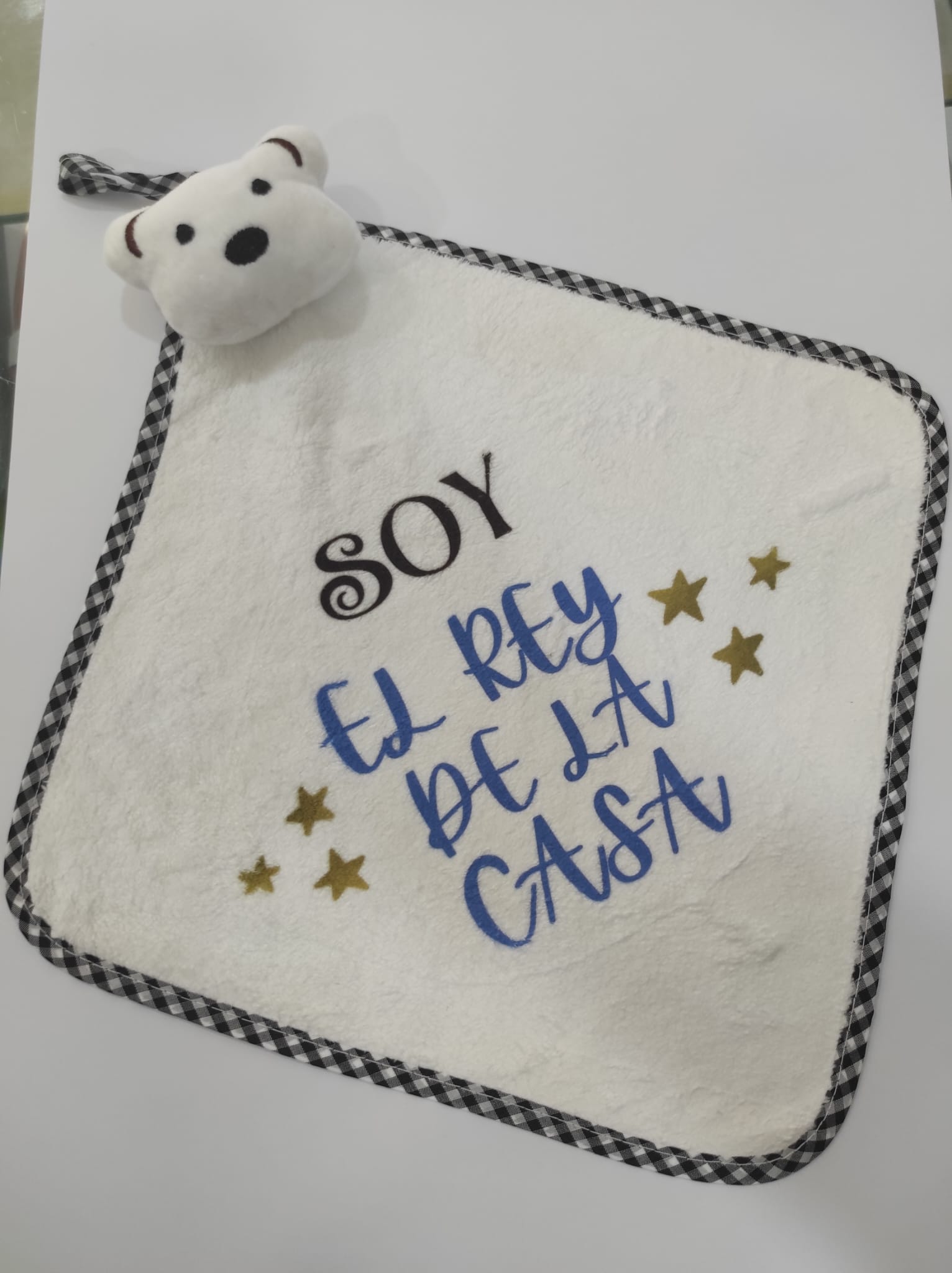 - Cabeza de osito con colgador en la esquina y ribete de cuadros blancos/negros cosido en el borde