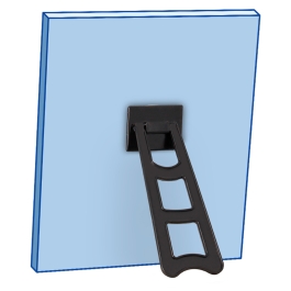Soportes de plástico para exhibir azulejos, platos de cerámica y paneles fotográficos sobre superficies planas.
